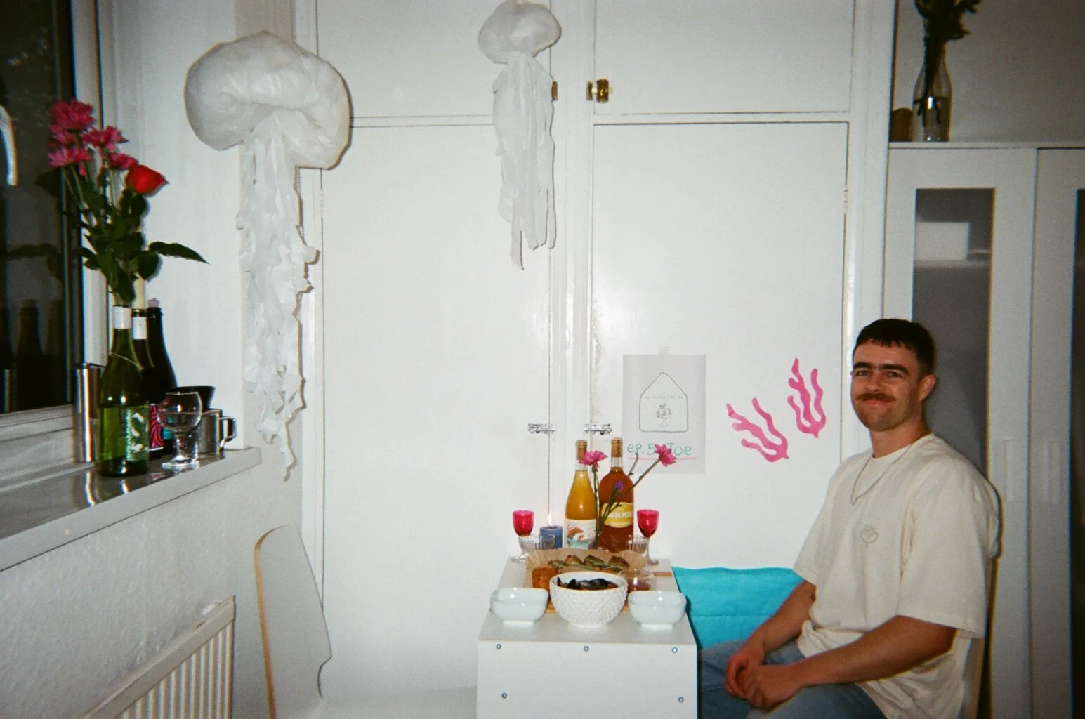 So, I wanted to create a space that felt like being underwater. To bring this oceanic atmosphere to life, I crafted jellyfish decorations using discarded plastic bags, repurposing them to add an ethereal, floating effect.